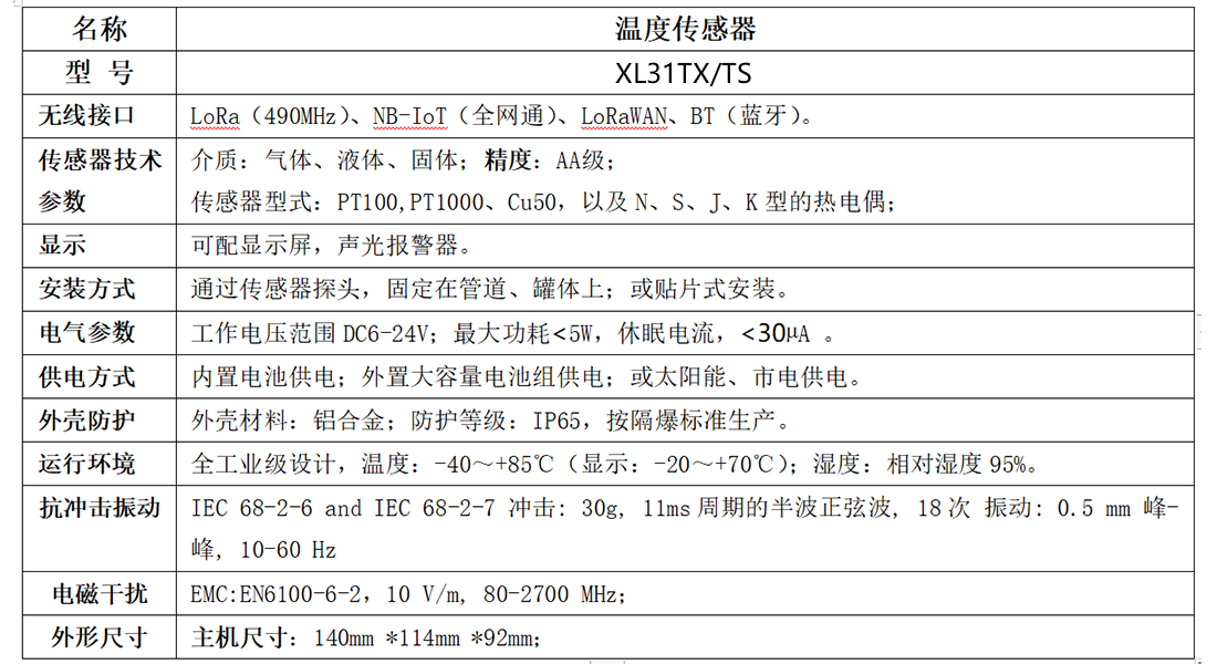 XL31TX/TS智能温度传感器,集成传感元件、信息处理、无线通讯、电池供电等于一体。通讯中断保存数据,通讯恢复重传数据,超限主动上传数据,电池能量低上传报警数据。