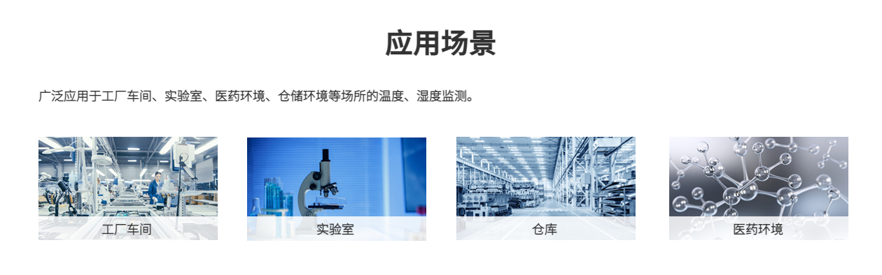 工厂车间、实验室、医药环境、仓储环境等场所的温度、湿度监测。