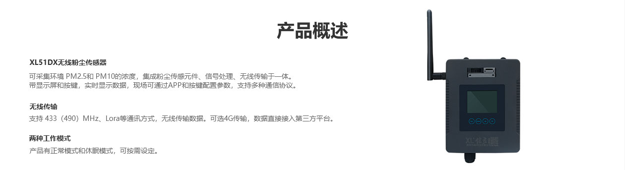XL51DX无线粉尘传感器,采集环境 PM2.5和 PM10的浓度,集成粉尘传感元件、信号处理、无线传输于一体。带显示屏和按键,实时显示数据,现场可通过APP和按键配置参数,支持多种通信协议