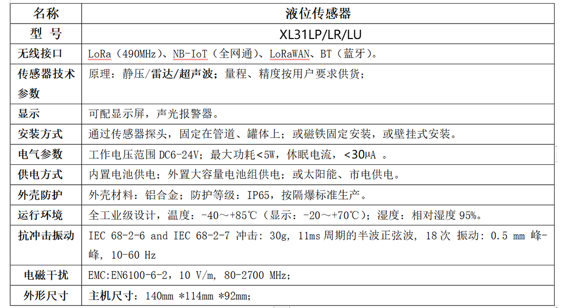 XL31LP智能液位传感器,集成传感元件、信息处理、无线通讯、电池供电等于一体。通讯中断保存数据,通讯恢复重传数据,超限主动上传数据,电池能量低上传报警数据。