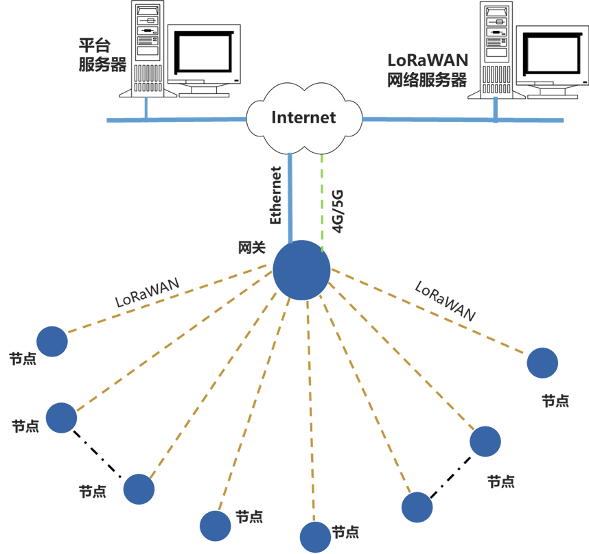LoRaWAN构建标准的无线通信星形网络;相同地区标准的LoRaWAN产品,都可上传数据至不同品牌的LoRaWAN网关。