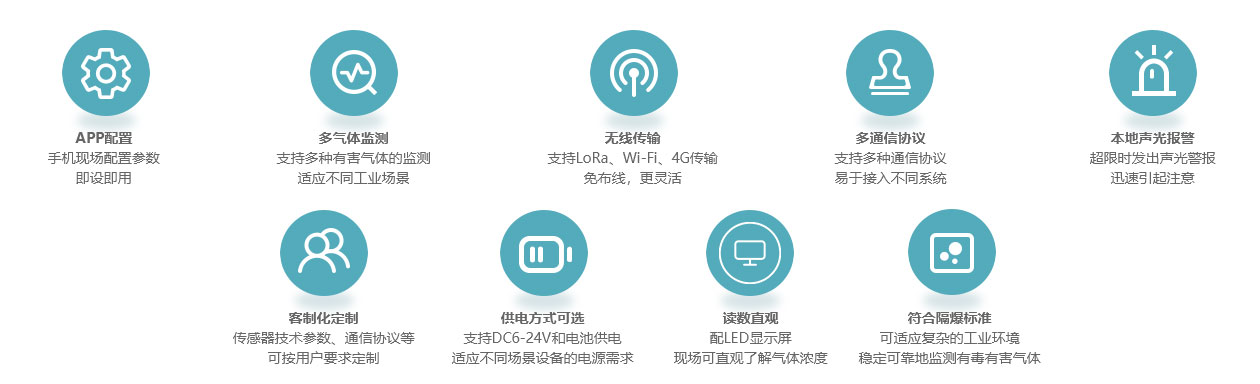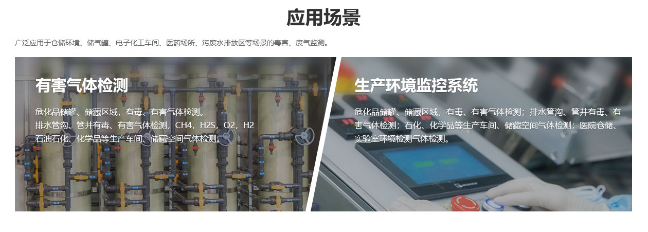 电子生产加工车间氟化氢(HF)监测;充电间酸雾、氢气(H2)监测;氮气储罐区域氧气(O2)监测;危化品存放区、仓库、污水处理池等场所有毒有害气体监测。