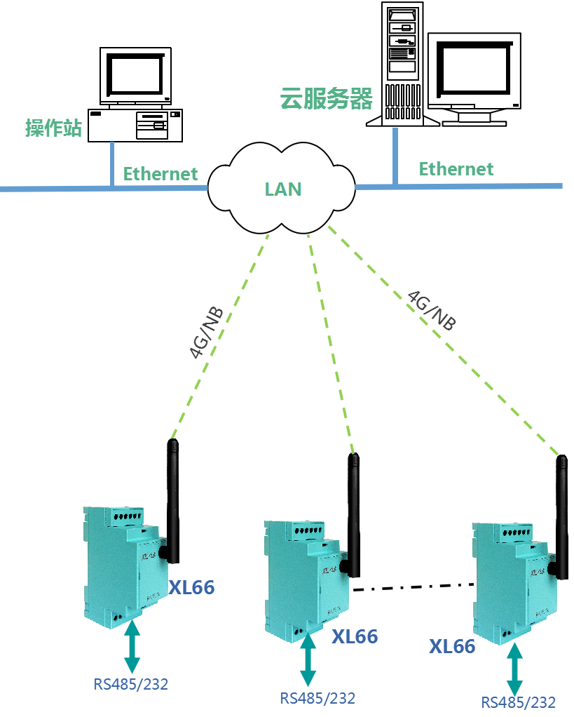 工厂、车间、园区等,有RS485或232通信接口的控制器、二次仪表、变送器等,通过XL66实现无线联网。
