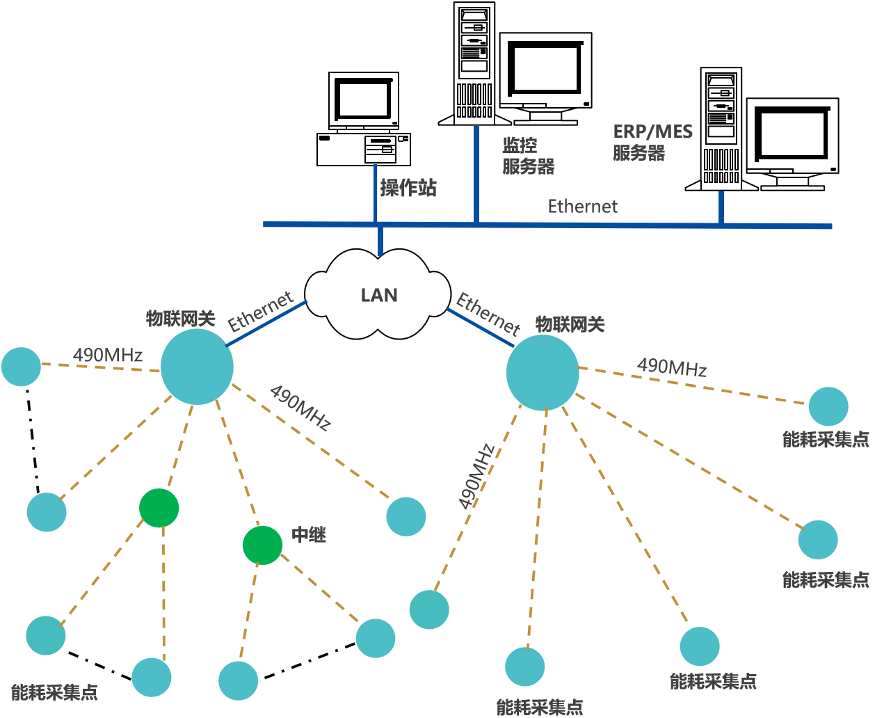 采集节点智能装置,通过LoRa上传能耗数据至物联网关,网关通过Ethernet或Wi-Fi,接入企业内部LAN,推送数据至企业能源管理系统,及MES等和其它系统;