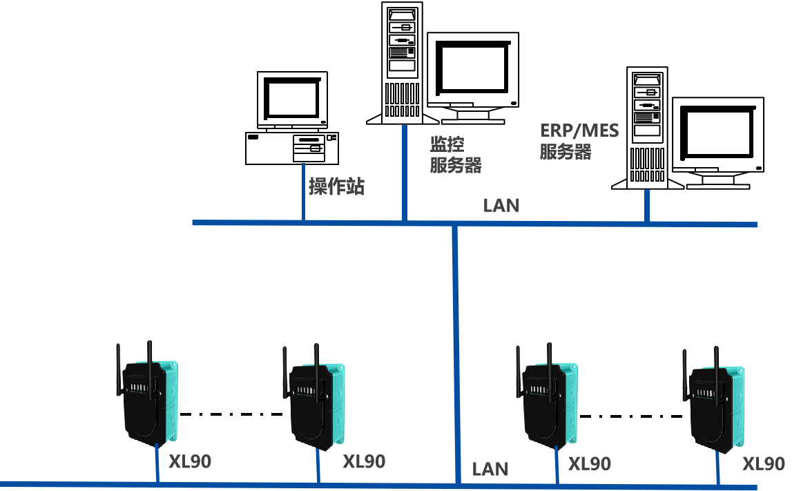 XIoT能源消耗监控管理系统平台,由1套XL.Cloud软件、1台监控服务器构成;通信网络由多台XL90物联网关,及LAN构成。