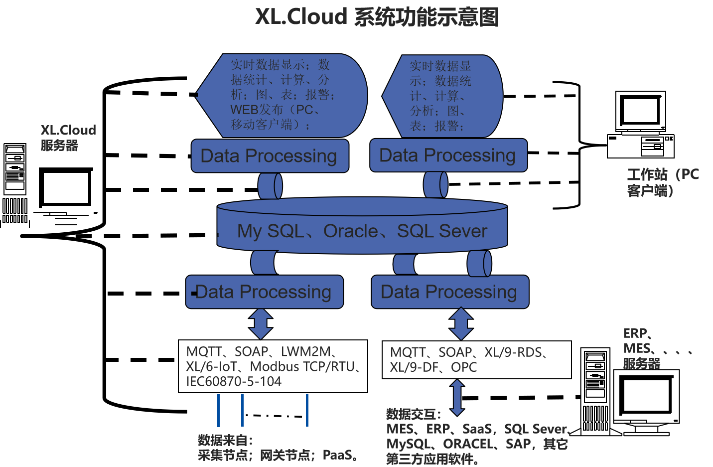 支持MQTT、LWM2M、SOAP,XL/6-IoT、XL/9-DB、XL/9-RDS,等等通信协议,并可和第三方数据库,Oracle、SAP等交换数据;