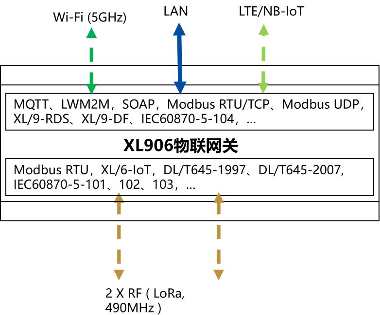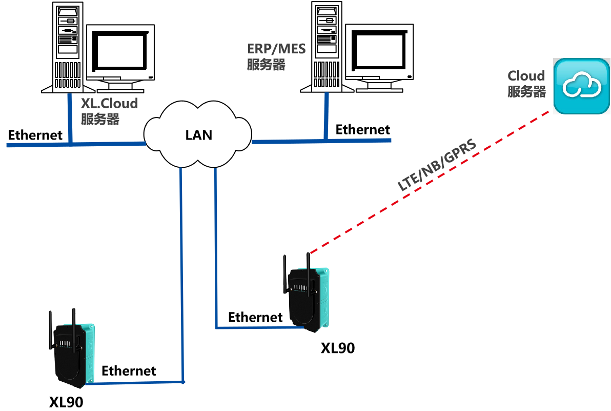 如下图所示,XL90,将数据上传给企业内部的多个系统软件平台;通过LTE(4g)/NB/GPRS将数据上传至云服务器;