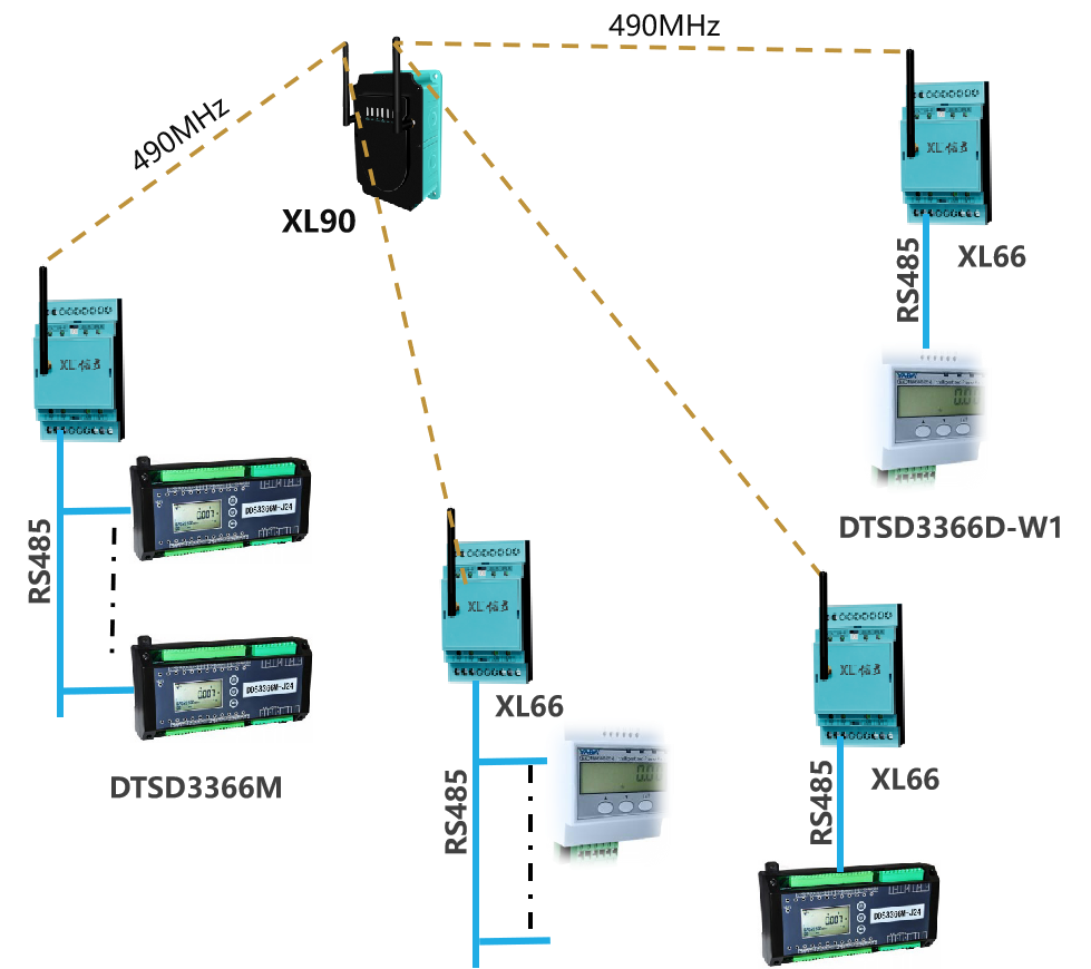 每个监测点,配置1台XL66智能转换器,从RS485/232接口,读取电能表的数据,无线方式上传至XL90物联网关;
