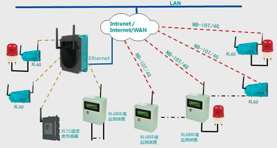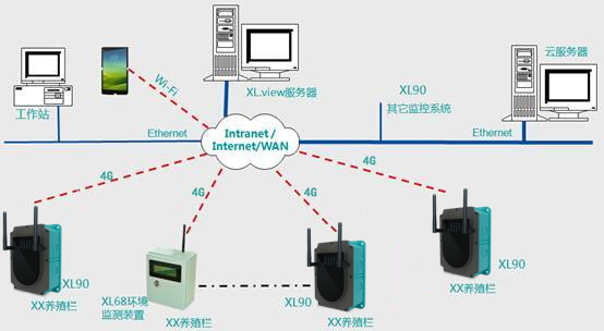 XL68智能环境监测终端(装置),采集空气温湿度、H₂S、NH₃、O₂、CO₂等等气体浓度,光照、差压等等信号;简单应用中选择XL51温湿度传感器采集空气温湿度;XL60无线采集装置控制养殖栏内的参数,起动风机、加热装置、湿帘、照明,起动声光报警器,采集用水量、用电量、水压等等用户关注的参数。