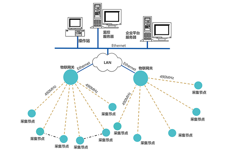 采集节点通过490MHz无线上传数据至物联网关,网关通过Ethernet接入LAN,推送数据至企业管理平台服务器;
