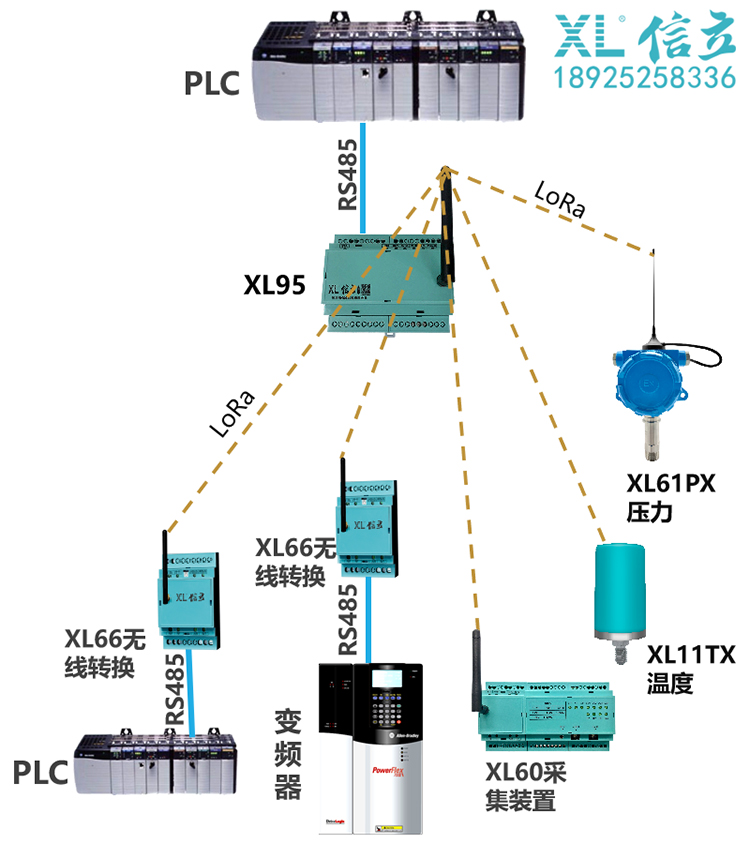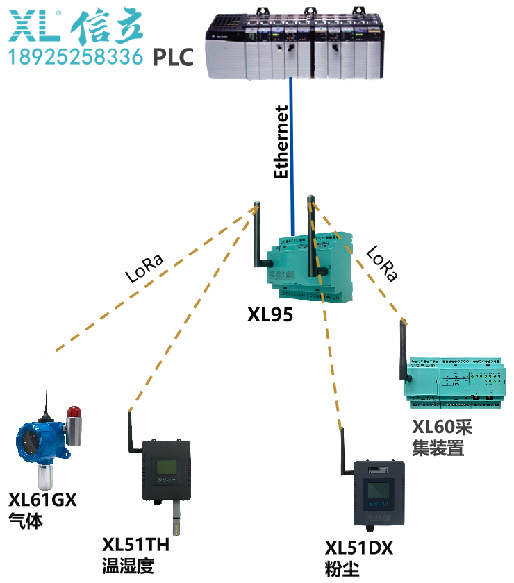 XL9X网关,无线读取采集节点的数据,通过RS485,Ethernet转发数据至PLC;