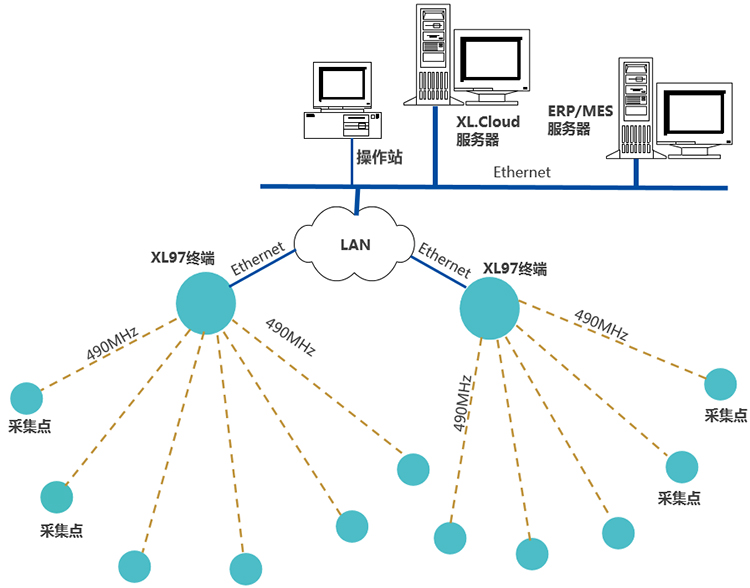 1、采集点获取机器运行数据、现场生产环境数据、机器生产数据,无线上传至XL97终端;
