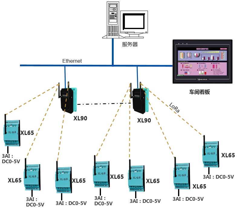 采集点装置,通过LoRa无线通讯上传数据至物联网关,网关通过Ethernet或Wi-Fi,接入LAN,推送数据至企业生产管控服务器。