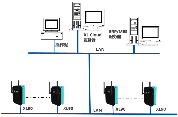 基于XIoT技术的贴片机电池电压数据采集系统,平台由1套XL.Cloud软件、1台监控服务器构成;通信网络多台XL90物联网关,及LAN构成。