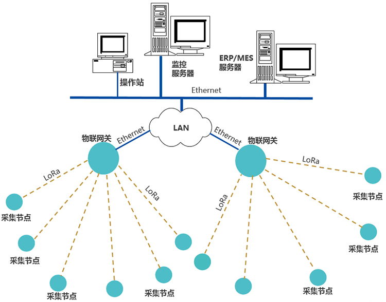 每个采集装置、传感器,通过LoRa无线通讯上传数据至物联网关,网关通过Ethernet或Wi-Fi,接入LAN,推送数据至企业生产管控服务器。