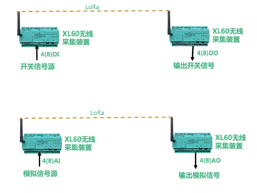 选择两台XL60无线采集装置,以一对一的无线传输方式,实现模拟、开关信号无线传输: