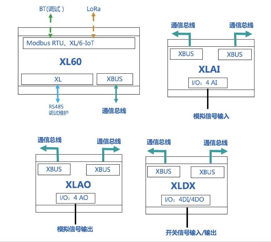 • I/O模块可选:XLDX(4DI/0-4DO)、XLAI(0-4AI)、XLAO(0-4AO) 。