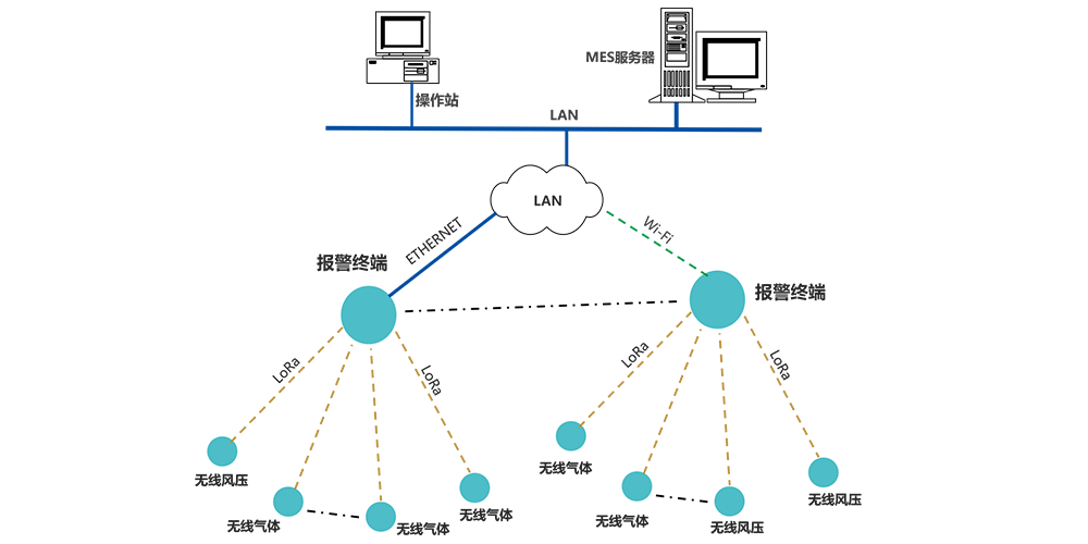 3. 报警终端无线读取监测点上传的数据,进行处理、显示、报警;并将数据通过局域网,MQTT协议,上传至MES。