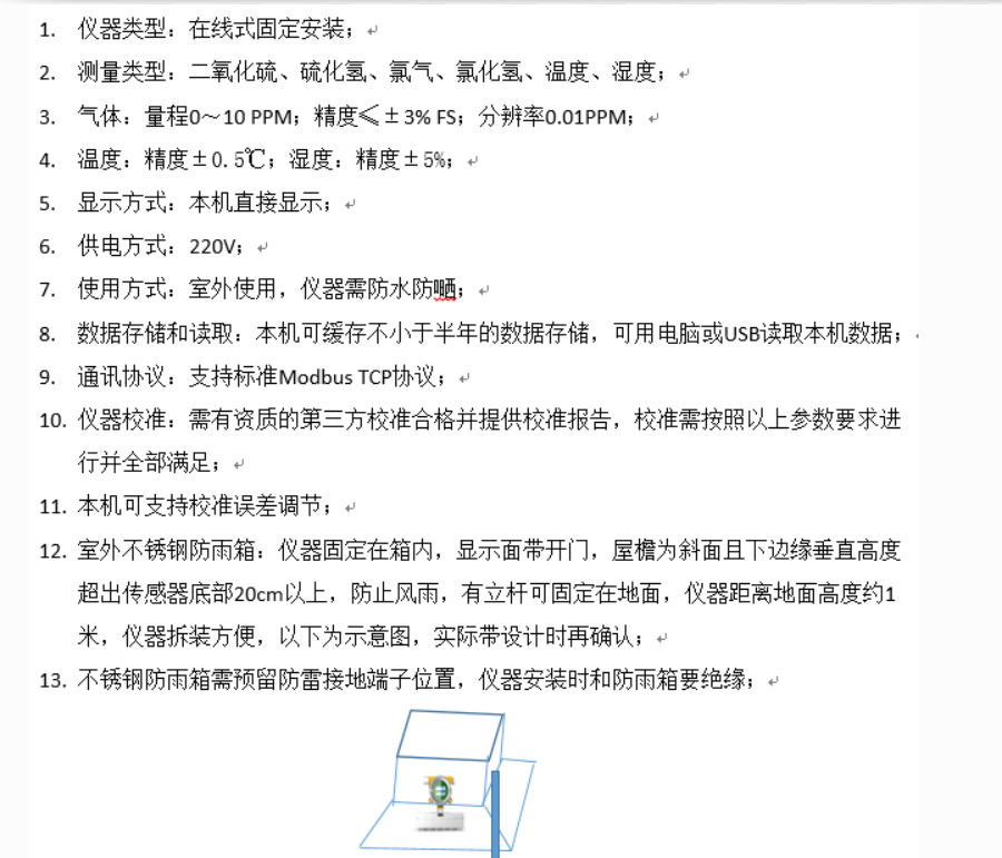 户外箱体配置:建议选择1套玻璃钢百叶箱,安装XL68环境监测终端及传感器探头。建议选择尺寸足够的标准产品。