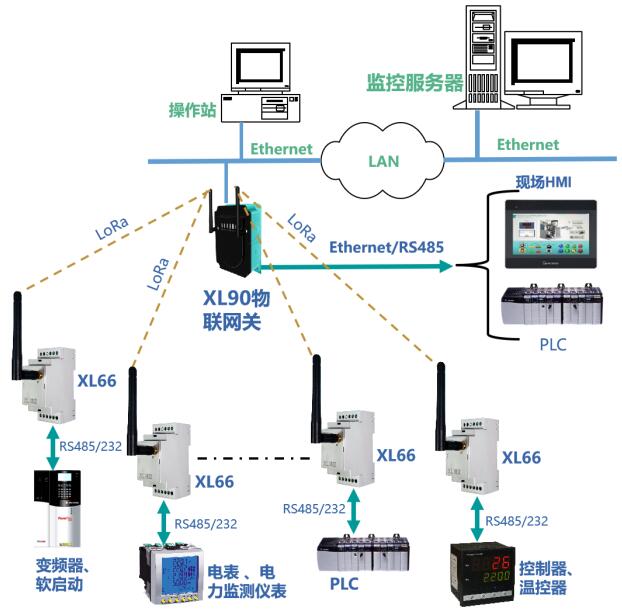 带RS485或232通信接口的控制器、二次仪表、变送器等设备,通过通信接口与XL66连接,XL66通过LoRa无线通信方式将数据上传至XL90或XL95物联网关,网关通过以太网或RS485,上传数据至监控平台、PLC、触摸屏、控制器等设备。从而实现有线串口设备的无线联网。