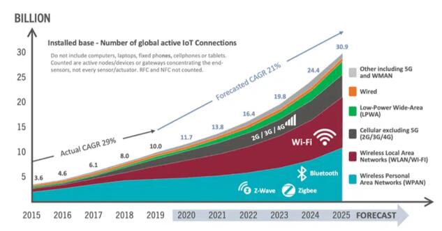 窄带物联网(NB-IoT)是IoT领域的一项新兴技术,它能够以低成本实现广泛的物联网连接,拓宽了物联网的潜在应用。根据爱立信Mobility Report November 2020的报告,接下来,NB-IoT/Cat-M(Cat-M1也被称为LTE-M)将出现爆炸性增长,从2020年的近2亿个联网设备增长到2026年底的约26亿个,占所有蜂窝物联网连接的45%。