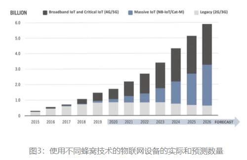 图3:使用不同蜂窝技术的物联网设备的实际和预测数量