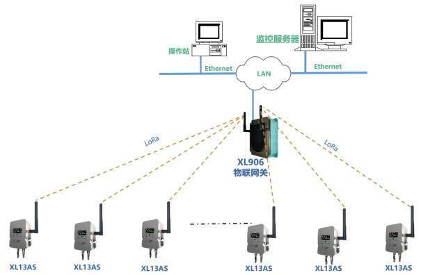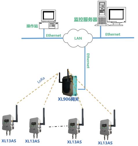 方案一:根据现场实际情况,部署XL906物联网关,XL13AS无线风管风速传感器通过LoRa无线传输数据至XL906物联网关,网关可选Ethernet、Wi-Fi、4G等多种方式将风速数据传输至监控平台。