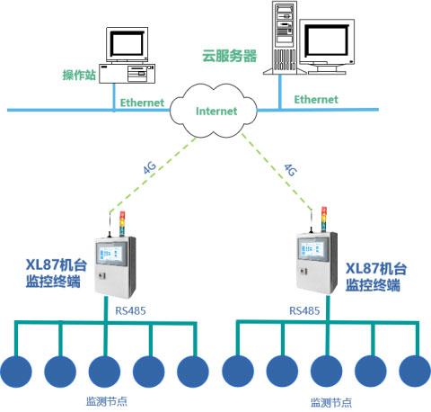 采集终端的数据通过RS485将数据传输至XL87监控终端,XL87监控终端通过4G通信将环境数据上传至云平台,平台软件可向操作站、监控看板、现场监控触摸屏推送数据。