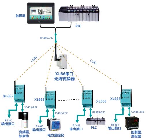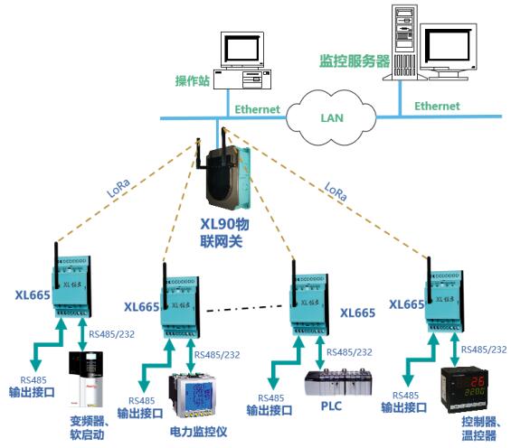 通过LoRa无线传输模块输出的数据,可上传至XL90物联网关接入监控软件平台,或通过XL66串口无线转换器,与PLC、触摸屏等通信。