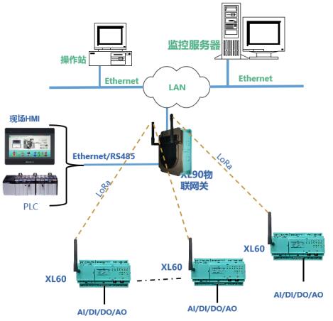 方案一:XL60无线采集装置采集的现场设备数据,采用LoRa无线传输方式,传输至XL90物联网关,经协议转换后将数据通过Ethernet或RS485上传至监控平台、PLC、触摸屏、控制器等设备。