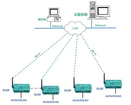 方案二:对于覆盖Wi-Fi的区域,XL60无线采集装置可直接通过Wi-Fi接入局域网,通过LAN直接推送数据至监控服务器。