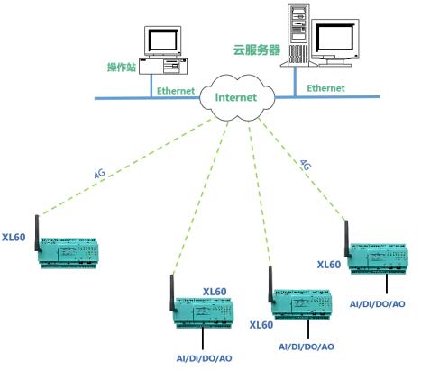 方案三:对于位置偏远或安装分散的设备运行参数,如管网、管沟的压力、温度、液位、流量、气体浓度等信号,XL60无线采集装置可采用4G通信将采集的数据直接上传至云平台。