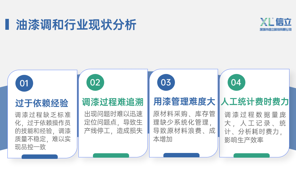 油漆调和,是工业涂装的重要环节,直接影响产品的质量。传统的油漆调和模式,往往依赖经验丰富的调漆师傅,存在质量不稳定、原材料浪费、数据不透明、低效率等问题。