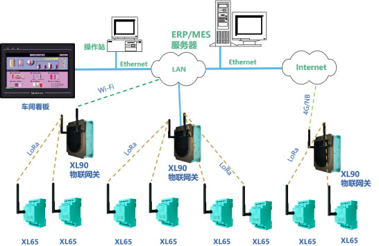 XL65无线采集器,通过LoRa无线通讯上传数据至XL906物联网关,网关通过EthernetWi-Fi4G,推送数据至监管平台或企业生产管控服务器。