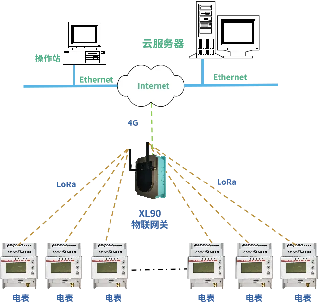 DTSD3366XL无线多功能电表获取数据,通过LoRa无线传输方式上传至XL90网关;XL90网关计算分析读取的能耗数据,并通过4G无线通信方式,将数据上传至监控平台。