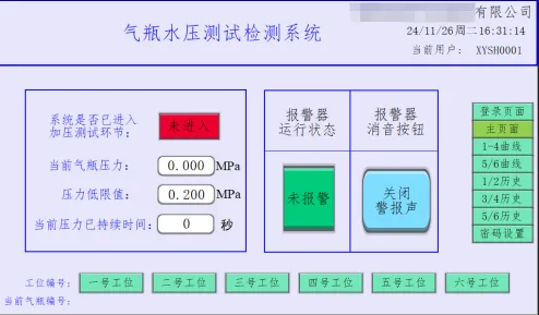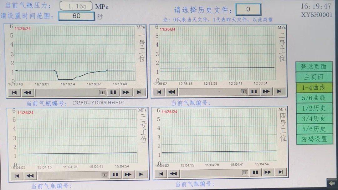 历史记录:自动记录测试时间、操作员身份信息、工位信息、钢瓶身份信息、压力数据,生成历史曲线;