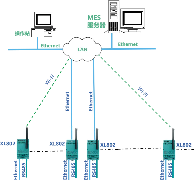 数据联网:XL80通信主机从设备通信接口读取设备或系统的运行数据,通信协议转换处理后,再通过Ethernet或Wi-Fi,接入企业LAN,转发数据至MES或监控平台。