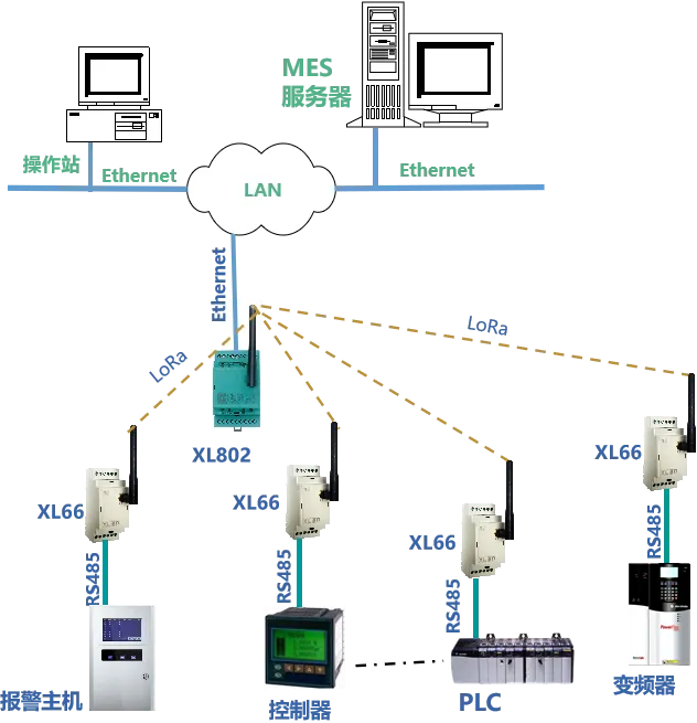 数据联网:XL80主机通过LoRa无线传输技术,从XL66无线读取设备的运行数据,通信协议转换处理后,通过Ethernet转发数据至MES或监控平台。