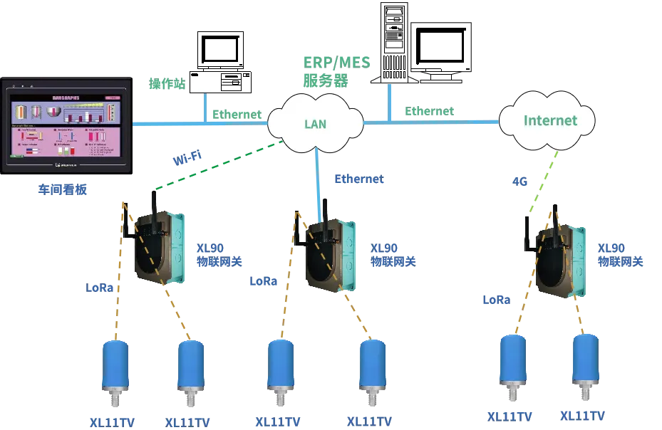 监测系统采用无线传输设计,XL11TV温振传感器采用LoRa 无线传输数据给XL90网关,网关对数据进行协议转换后,通过Ethernet/WiFi/4G传输数据至监控平台。